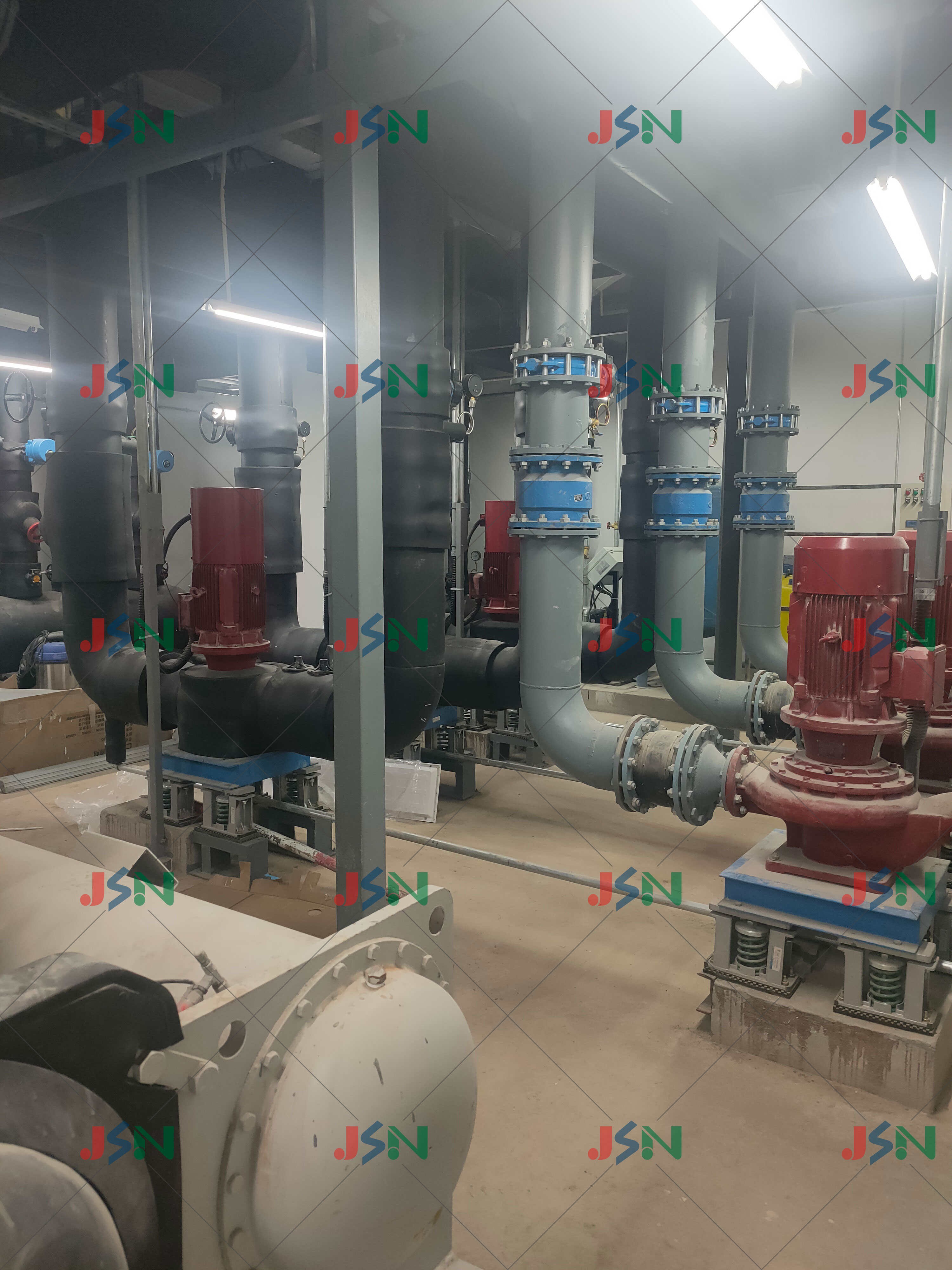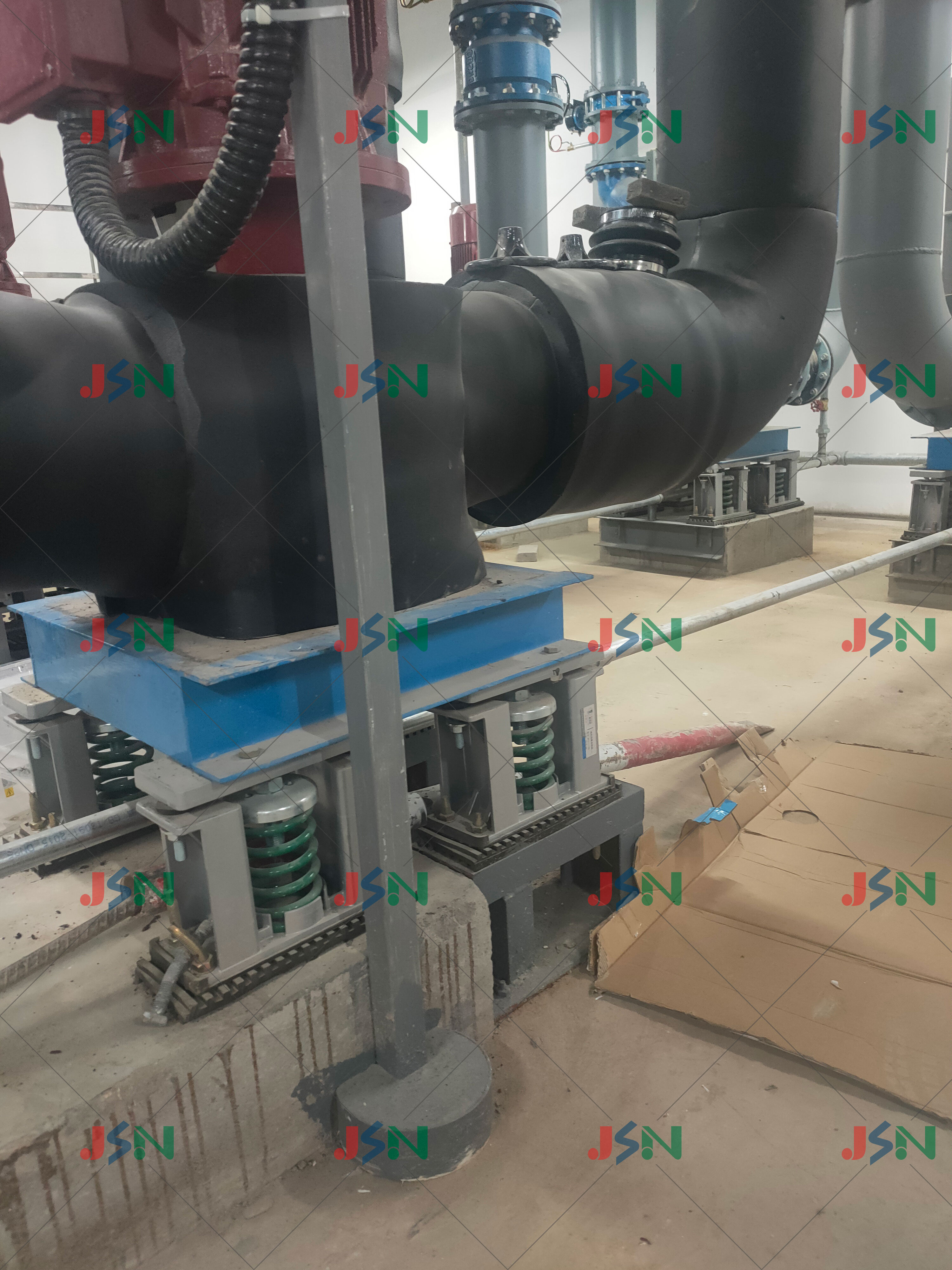 水泵配套金諾混合型減震臺座及JAD型撓度50mm可調(diào)式鋁合金減振器,水泵及管道之間安裝了XGD1型可曲撓單球體橡膠軟接頭,主機(jī)也是選用JAD型大撓度可調(diào)式彈簧減振器,目前在技術(shù)人員的指導(dǎo)下,產(chǎn)品已經(jīng)全部安裝完畢,減震效果極佳,得到了業(yè)主和施工單位的一致好評。