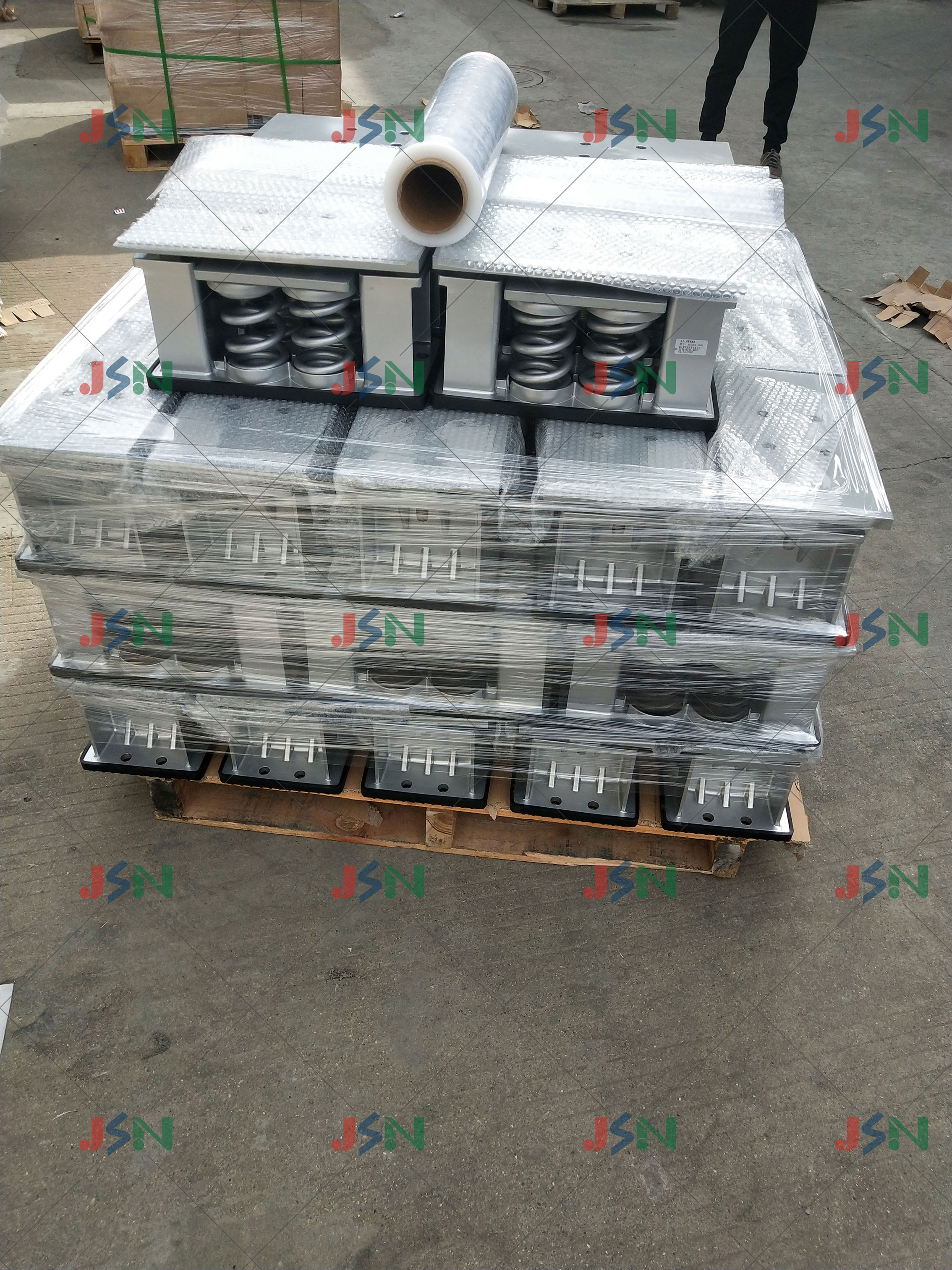 項目現(xiàn)場需要56臺減震臺座,高度最高的為500mm,項目工期特別緊張,要求一周內交貨,JSN主要負責減震臺座框架和材料的提供(包括鋼筋),成品現(xiàn)場澆灌,通過保證質量努力趕工,6天就順利完成交貨(將近20噸的原材料),得到項目方的一致好評,在工程項目中交貨即使晚一天,對現(xiàn)場的成本會造成特別大的損失,選擇JSN金諾品牌減振器,80%以上的產(chǎn)品均為現(xiàn)貨供應,這次臺座配套的JA型阻尼彈簧減振器,均為現(xiàn)貨供應。